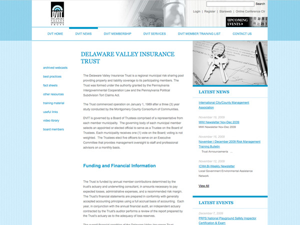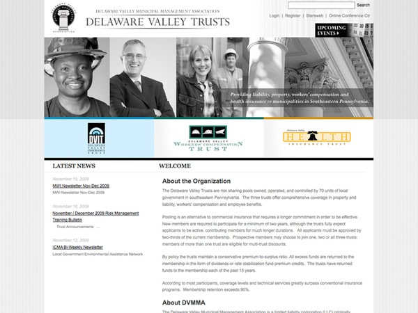 The Delaware Valley Trusts are risk sharing pools owned, operated, and controlled by 70 units of local government in Southeastern Pennsylvania. The three trusts offer comprehensive coverage in property and liability, workers' compensation and employee benefits. I was head of design for the project.