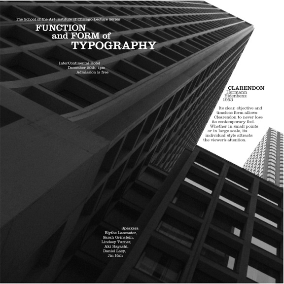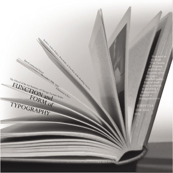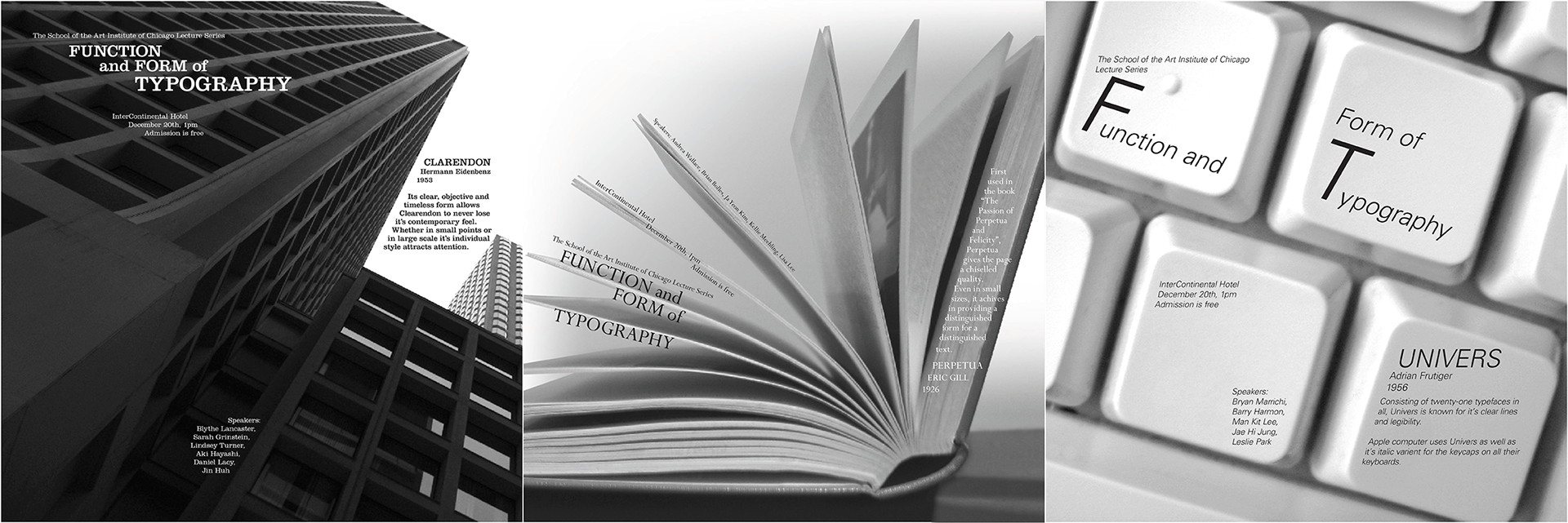 Poster designs for a typography lecture series. The three posters were created to each focus on an era of typography. They can either stand alone or be lined up to create a larger poster.