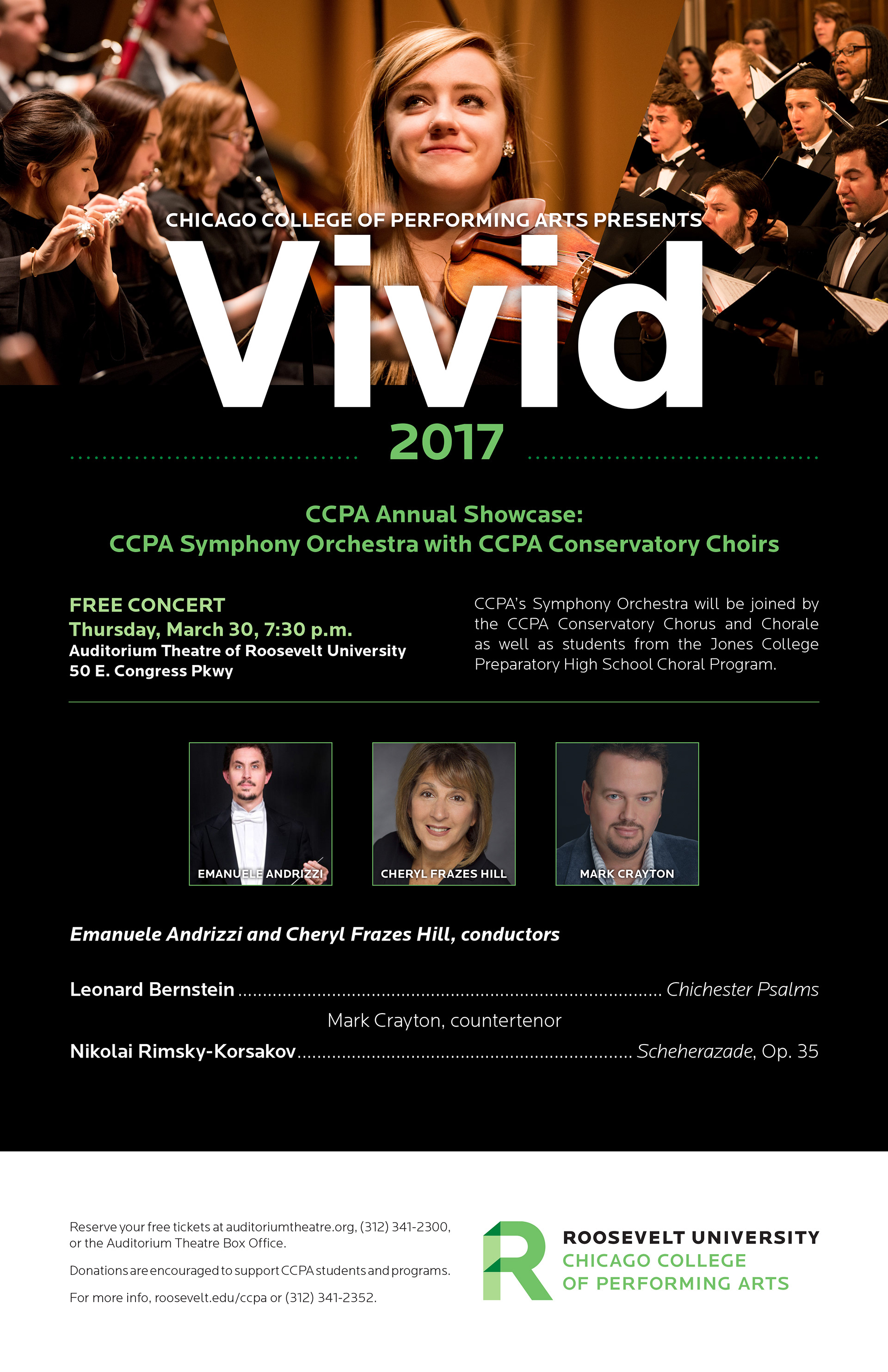 Posters and hand cards for Roosevelt University's VIVID, an annual Chicago College of Performing Arts student showcase. Other materials included programs, flyers and exterior Auditorium Theatre signage.