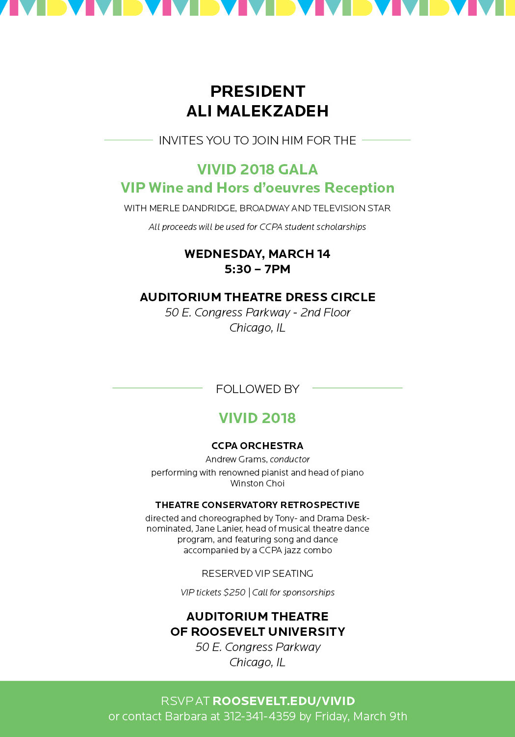 Auditorium Theatre signage, VIP reception invite, email, poster and flyer for Roosevelt University's VIVID, an annual Chicago College of Performing Arts student showcase. 2018 saw two milestone anniversaries for the Music and Theatre conservatories, and to celebrate anniversary logos were created. I also developed a refreshed brand for VIVID.